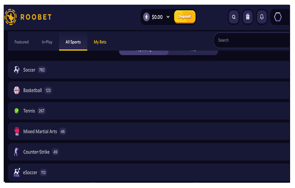 A screenshot of Roobet’s sportsbook menu